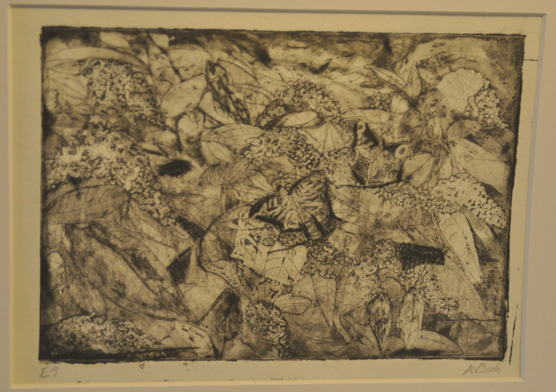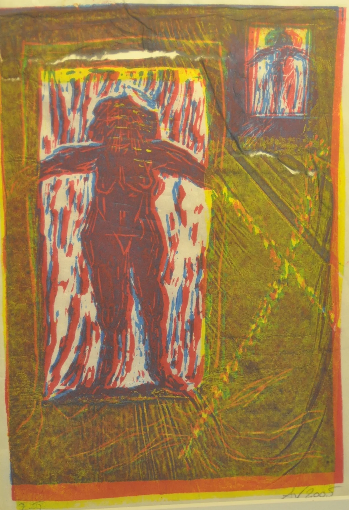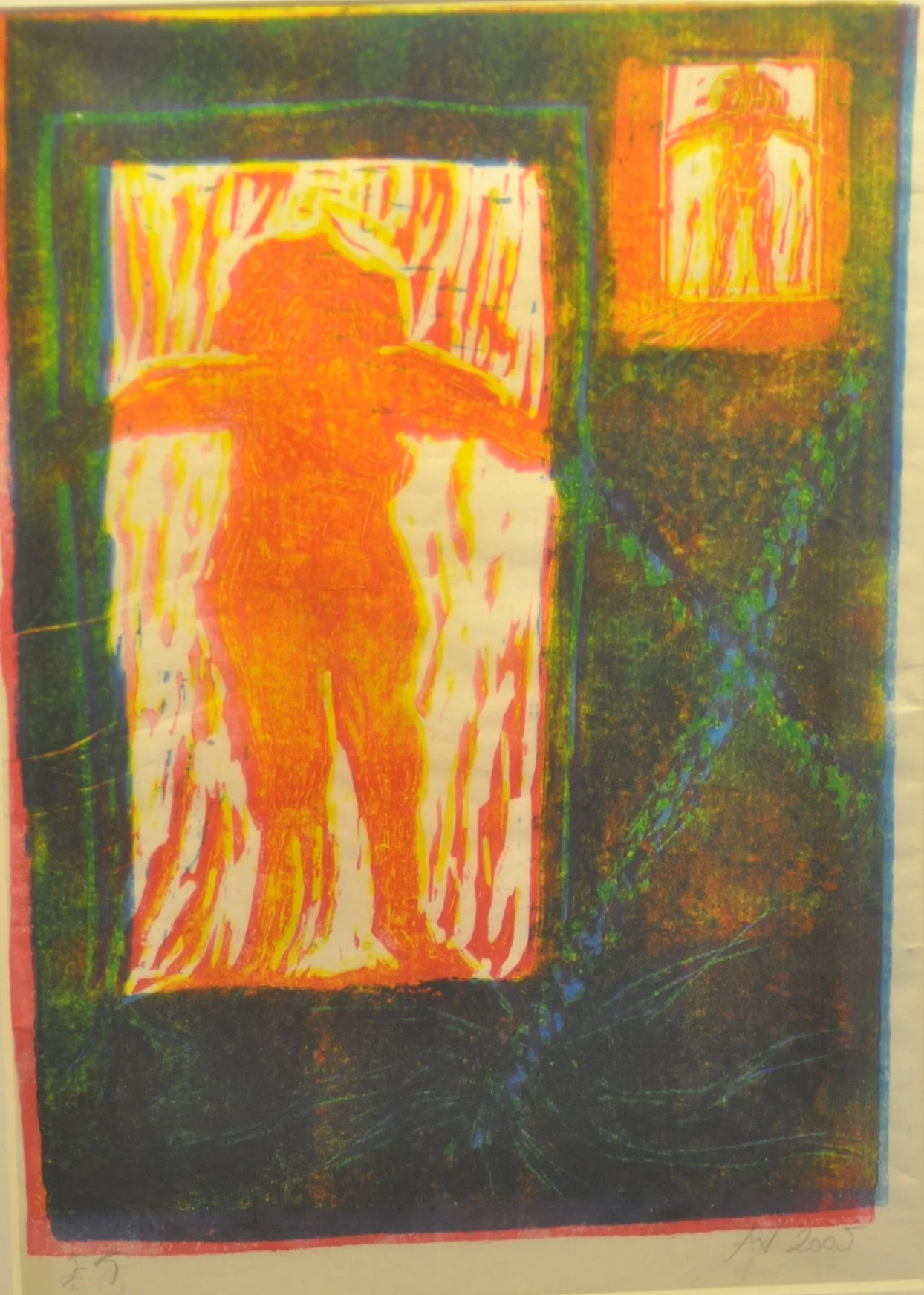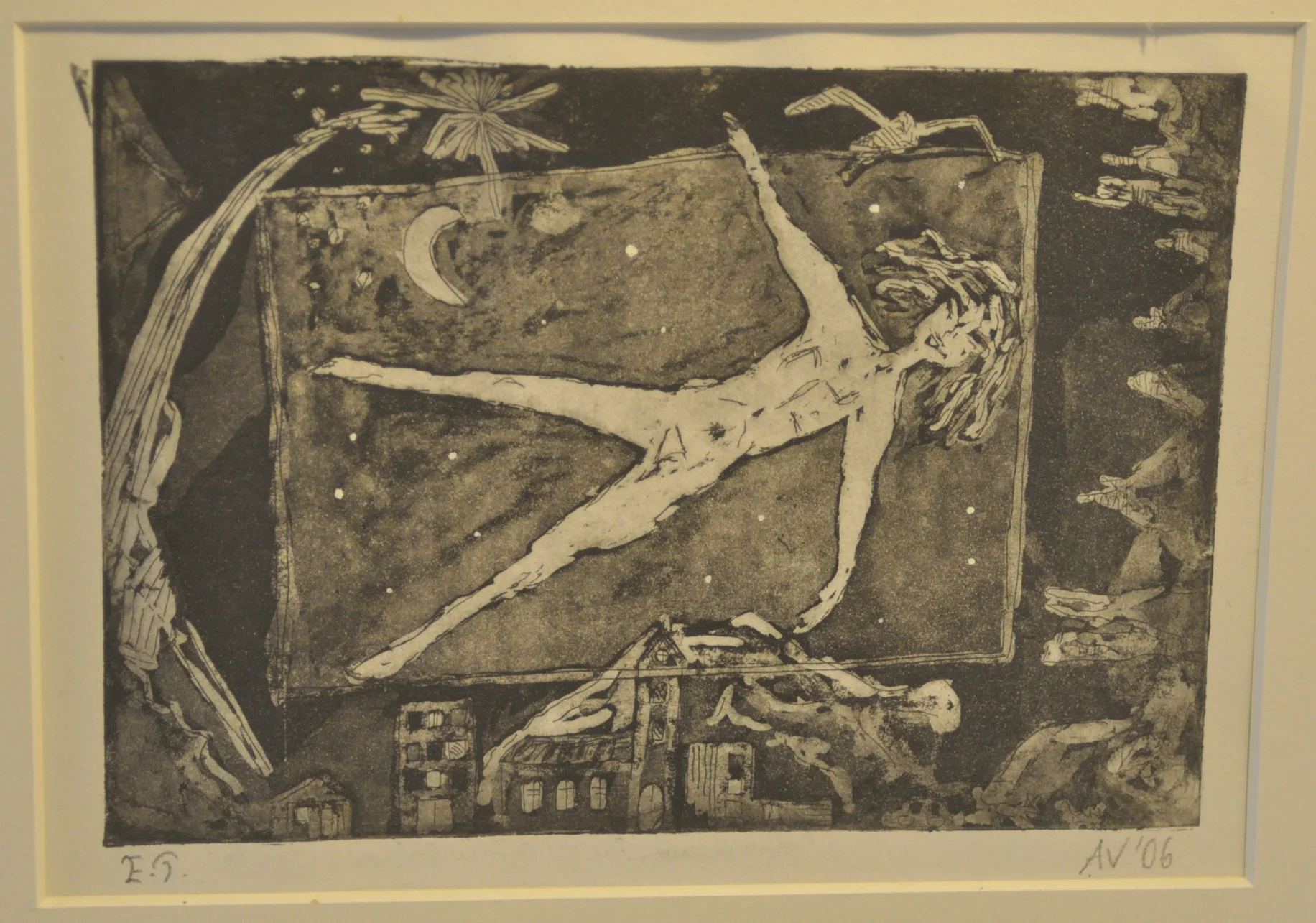 I galleriet er der f.eks. en serie akvareller, to-minuttersbilleder, som er en parafrase over en folkloristisk billedserie af egnsdragter. De er malet ud fra model. Der er også en del tryk. Både raderinger, linoliumstryk og aquatinteætsninger. Aquatinteætsningerne har i forhold til raderingerne og linoleumstrykkene et mere eventyrligt præg, selvom de kan udspringe af ret konkrete motiver. Et sommerhus i Vestjylland og figurer enten i en øde natur, som gennembrydes af et særligt lys, eller selv skaber en åbning, er blandt motiverne.